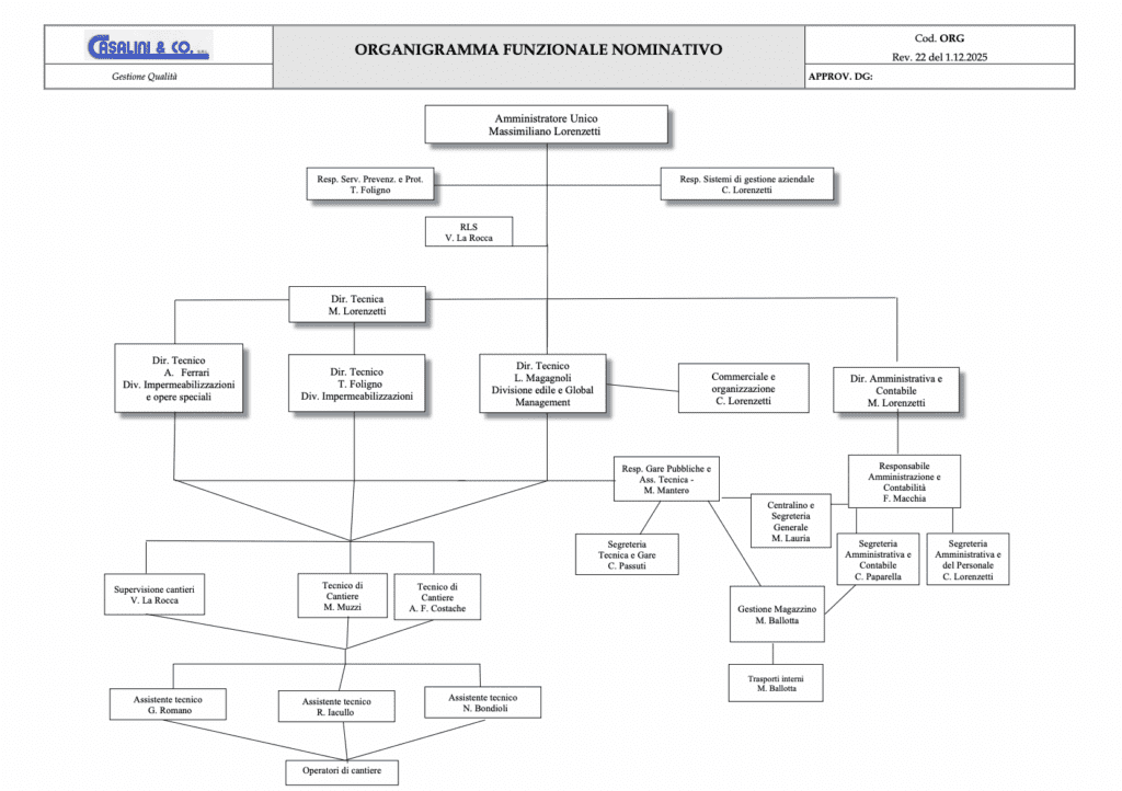 Casalini & CO S.r.l. è in possesso delle certificazioni certificazioni ISO9001, ISO14001 e ISO45001, ISO 37001:2016, SA 8000, ISO 26000:2010, ISO 30415:2021, UNI/PdR 18, UNI/PdR 125:2022, abilitazione per l’applicazione dei sistemi a freddo, certificazione per la posa di manti sintetici in poliolefine/pvc, iscrizione all’Albo Nazionale Gestori Ambientali e alla associazione di categoria Assimp.
